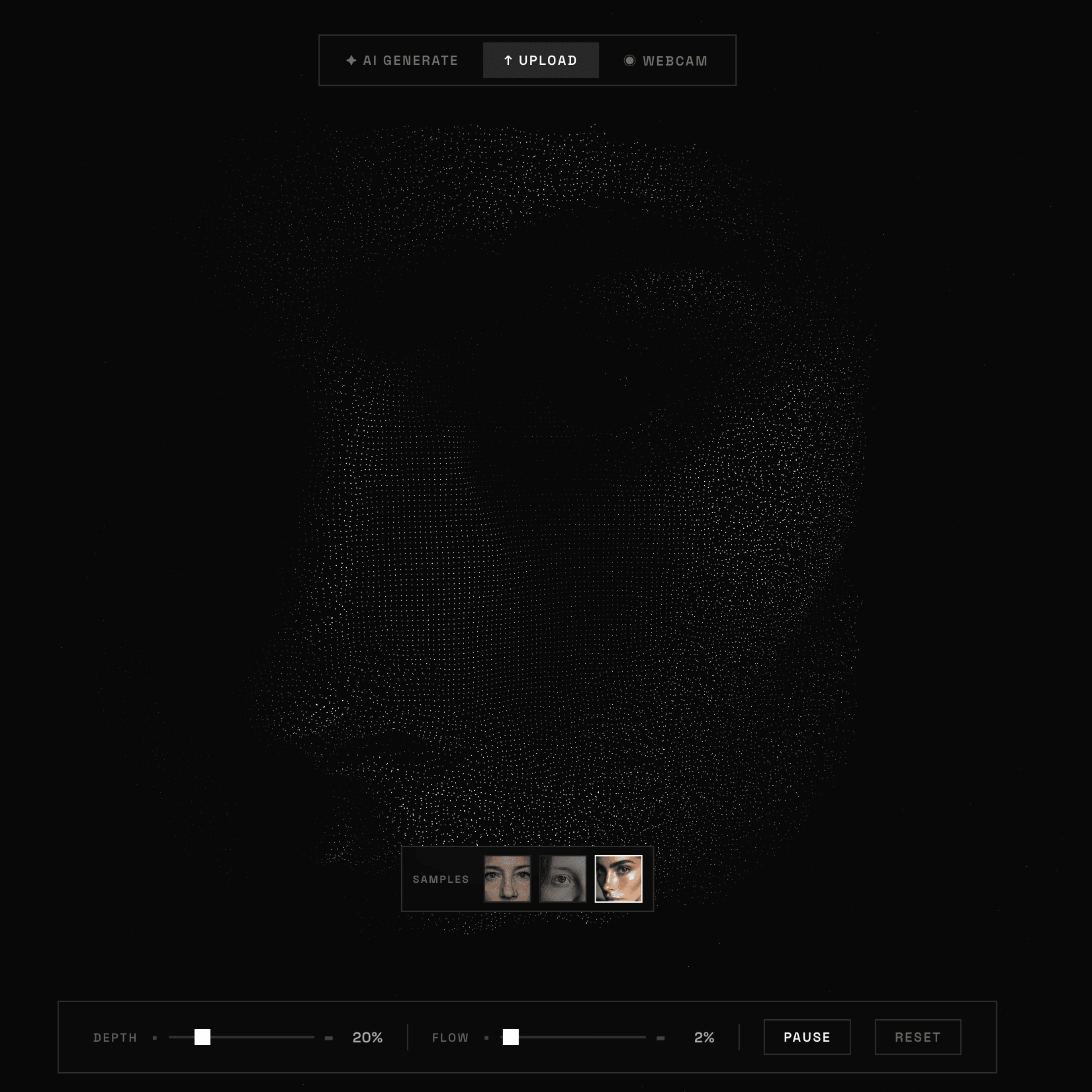 AI-generated imagery dissolved into interactive 3D particle fields